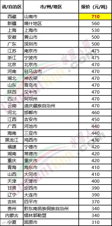 据水泥人网信息中心重点监控的30个省自治区近600家企业,市场主流水泥品种PO42.5水泥报价,最高报价仍集中在西藏地区,其中西藏山南区域报价710元/吨,为各区域最高。