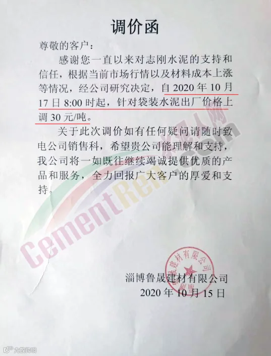 淄博鲁晟建材通知自10月17日8时起,针对袋装水泥出厂价格上调30元/吨。