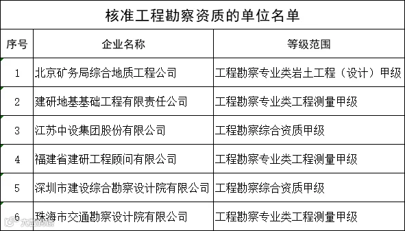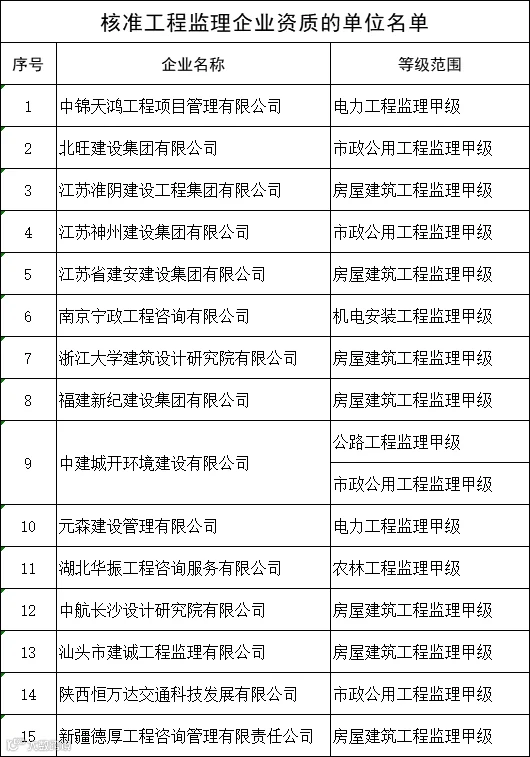 根据《中华人民共和国建筑法》及有关建设工程企业资质管理规定,现将我部核准的工程勘察资质、工程设计资质、建筑业企业资质、工程监理企业资质的单位名单予以公布。未予核准的单位及原因可登录我部门户网站(www.mohurd.gov.cn),点击办事大厅中“受理发证信息查询”栏目进行查询。