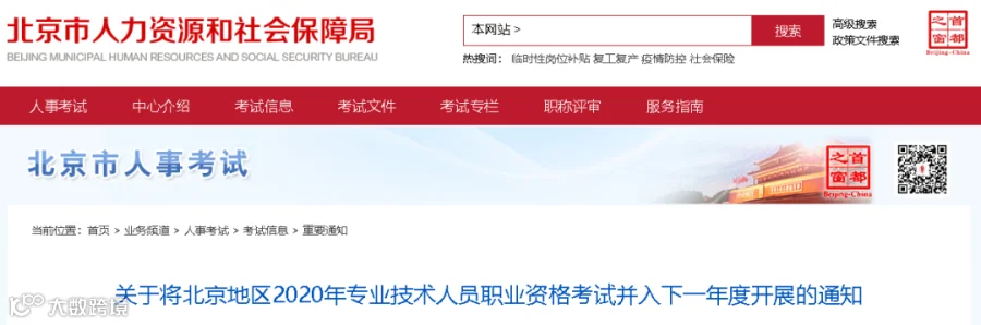 关于将北京地区2020年专业技术人员职业资格考试并入下一年度开展的通知