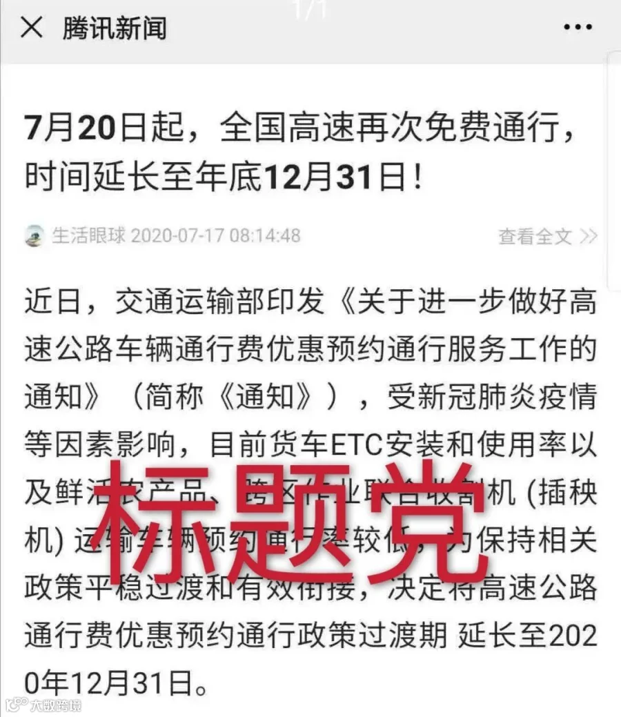 近日,网上有消息传:《7月20日起,全国高速再次免费通行,时间延长至年底12月31日》,是真的吗?