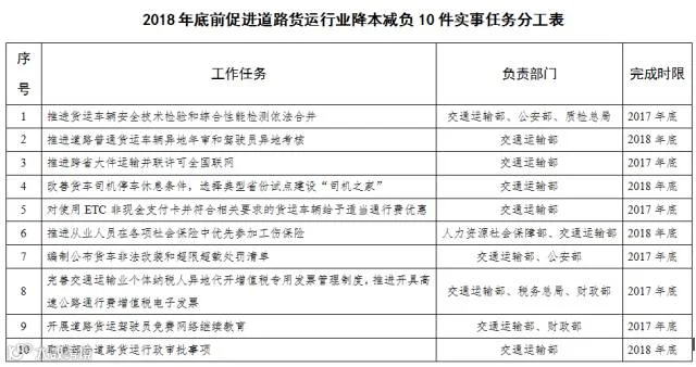 2018年底前,完成降本减负10件实事,推动政策落地并取得实质性进展。制度性交易成本大幅降低,货车司机生产生活条件显著改善,货运业户的获得感和货车司机的归属感持续增强,行业平稳发展的基础更加牢固。