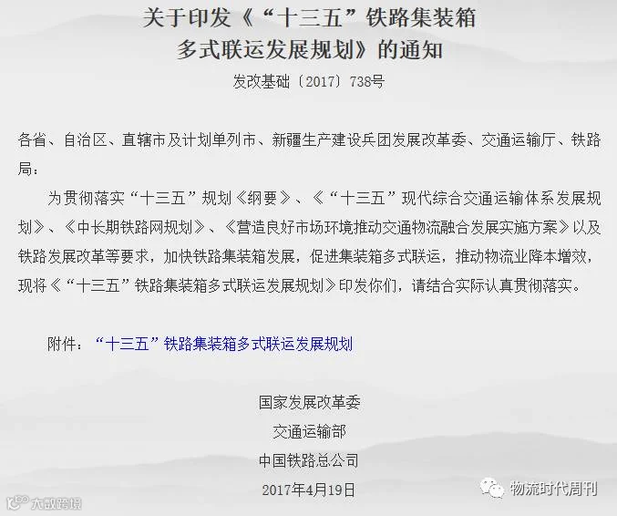 为增强铁路货运市场竞争能力、提升运输整体效率效益,根据“十三五”规划《纲要》、《“十三五”现代综合交通运输体系发展规划》、《中长期铁路网规划》、《营造良好市场环境推动交通物流融合发展实施方案》以及铁路发展改革等要求,制定《“十三五”铁路集装箱多式联运发展规划》。