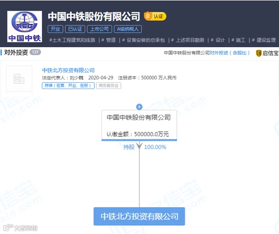 4月29日,中国中铁股份有限公司新增对外投资,被投资方为中铁北方投资有限公司,认缴金额为500000万元,持股比例为100%。关于中铁北方投资公司,在《中国中铁又一区域总部尘埃落定!》一文中已经谈过,即中铁北方区域总部(中铁北方投资公司)实行“一个机构,两块牌子”的管理模式。
