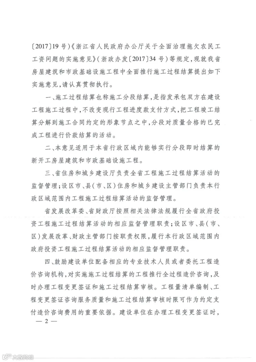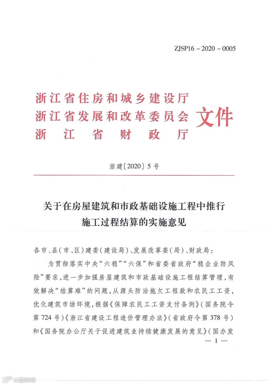 为贯彻落实中央 “ 六稳”“ 六保” 和省委省政府"稳企业防风要求,进一步加强房屋建筑和市政基础设施工程结算管理,有效解决 “结算难 " 的问题,从源头防治拖欠工程款和农民工工资,优化建筑市场环境,根据《保障农民工工资支付条例》(国务院令第724号)《浙江省建设工程造价管理办法》(省政府令第378号)和《国务院办公厅关于促进建筑业持续健康发展的意见》(国办发[2017] 19号)《浙江省人民政府办公厅关于全面治理拖欠农民工工资问题的实施意见》(浙政办发[2017]34号)等规定,现就我省房屋建筑和市政基础设施工程中全面推行施工过程结算提出如下实施意见,请认真贯彻执行。