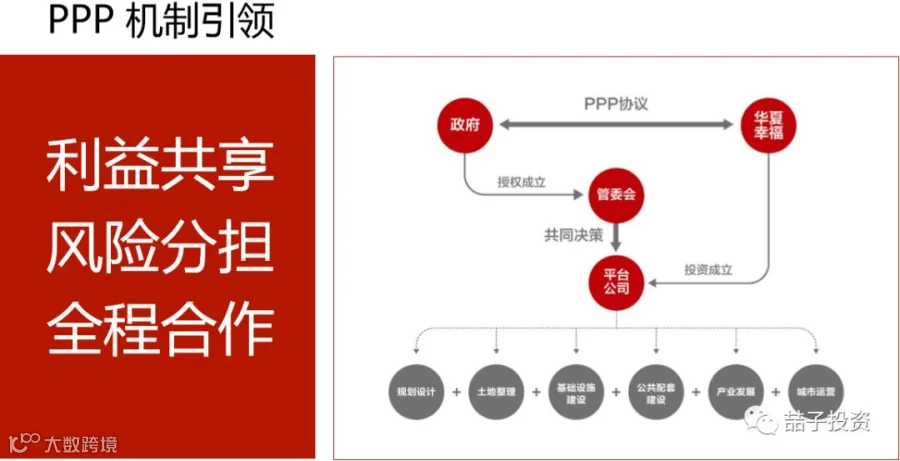 华夏幸福和地方政府签订的PPP协议中,开发面积少则几平方公里,多则上百平方公里,时间少则十几年,多则半个世纪。如果一个区域开发成功,那么后期能在很少投入的情况下源源不断的产生持续收入。可以这么理解,类似于种树,前期土地整理、施肥、浇水、打药等精心照顾,全是投入项,后期果树长大了,只需要简单照顾,每年就能源源不断地带来非常可观的收入。