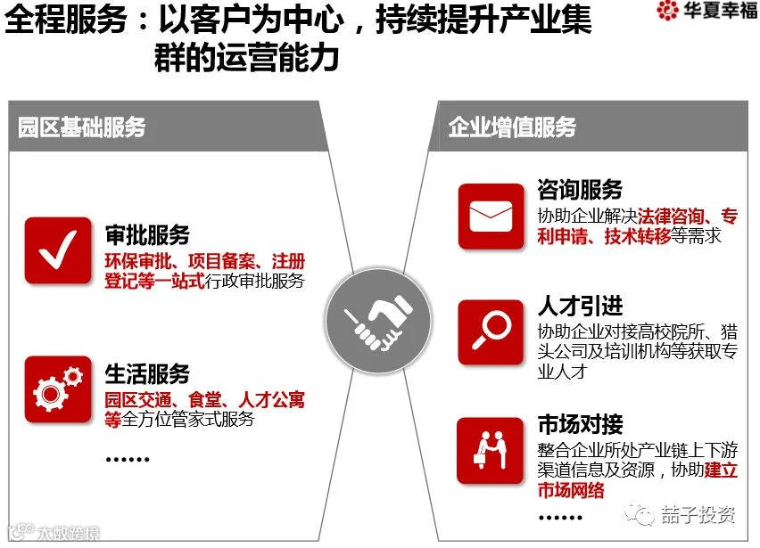 不同的企业,有不同的需求,企业考虑在某地方落地,会有对交通成本、原料供应、产业聚集、劳工成本、建筑成本、土地成本、生活设施、政府扶持政策、银行贷款利率优惠等多方面考虑,华夏幸福在这方面有一套自己的打法。