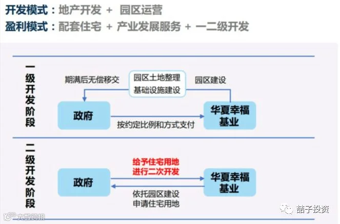 从图中可以看出,华夏幸福的开发业务范围涉及一级开发、二级开发两个阶段,以上两个阶段做完,还会涉及到园区招商、管理、运营、企业服务等环节的最终阶段,难度依次递增。
