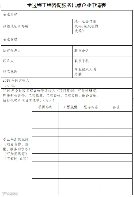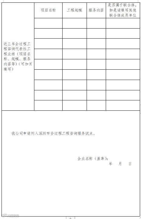 一、深圳市勘察设计、工程监理、造价咨询等企业具有相应专业甲级资质,具有大型工程项目工程咨询服务业绩,可申请为全过程工程咨询试点企业。请申请企业填写《全过程工程咨询服务试点企业申请表》(附件1),并附近三年全过程工程咨询代表性项目合同复印件(加盖公章)。