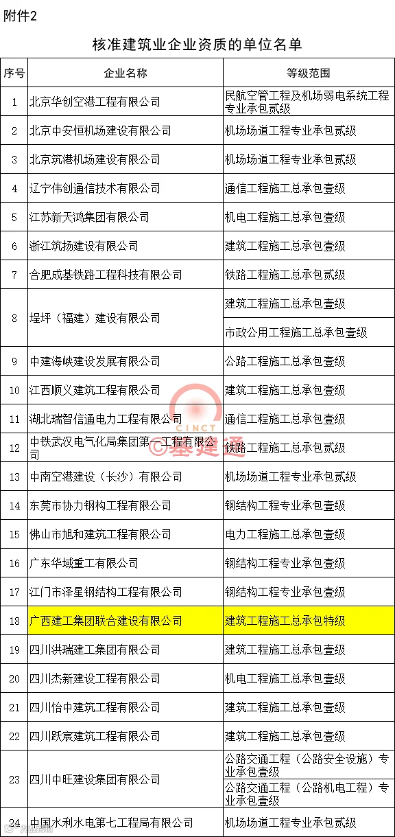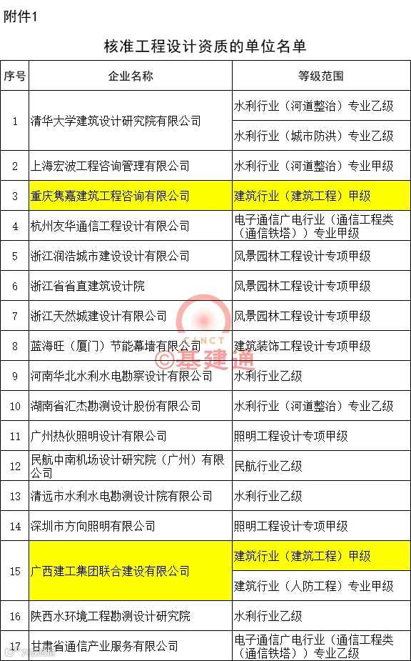 此次核准的名单中,获得工程设计行业甲级资质的单位有2家:重庆隽嘉建筑工程咨询有限公司和广西建工集团联合建设有限公司,他们均拿到了1项建筑行业(建筑工程)甲级。其中,广西建工集团联合建设有限公司除拿到了1项行业甲级资质外,还收获了1项特级资质——建筑工程施工总承包特级,也是本批次唯一一家“升特”的企业。