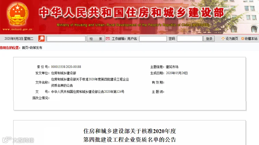 6 月 2 日,住建部发布了关于核准 2020 年度第四批建设工程企业资质名单的公告。