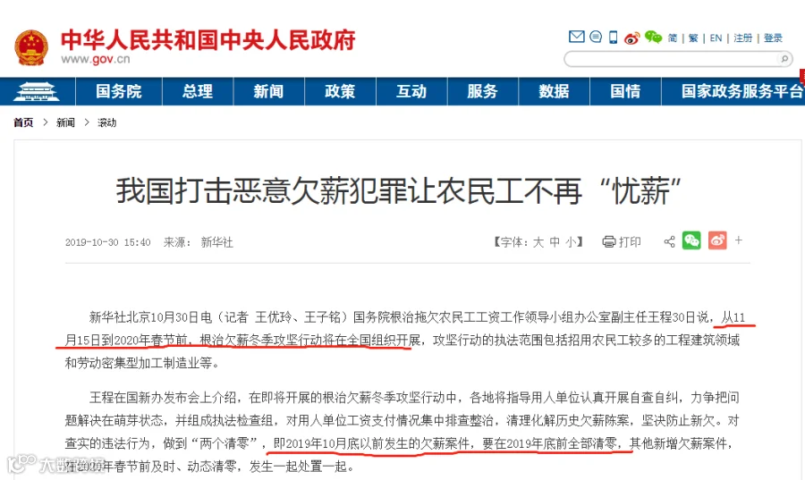 日前,国务院根治拖欠农民工工资工作领导小组决定:从11月15日到2020年春节前,在全国组织开展根治欠薪冬季攻坚行动。