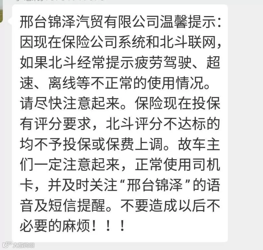 近日,有卡友发来消息:保险公司系统和北斗联网,如果北斗经常提示疲劳驾驶、超速、离线等不正常的使用情况。请尽快注意起来。保险现在投保有评分要求,北斗评分不达标的均不予投保或保费上调。