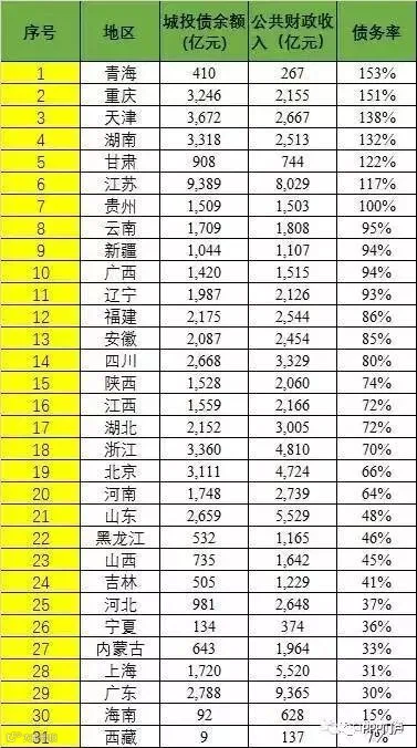 青海在在2016年狭义省级政府债务率排名(以城投债余额和地方公共财政收入计算)中排名第1,主要是因为青海自身的财政收入规模太小。