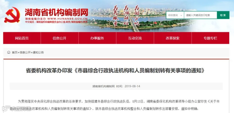 8月13日,湖南省委深化机构改革领导小组办公室印发《关于市县综合行政执法改革机构和人员编制划转有关事项的通知》,就综合执法改革机构整合作出部署。