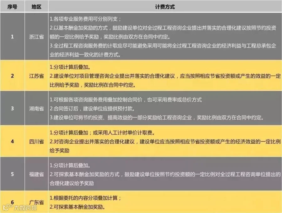 不同地区全过程咨询业务计费方式一览表
