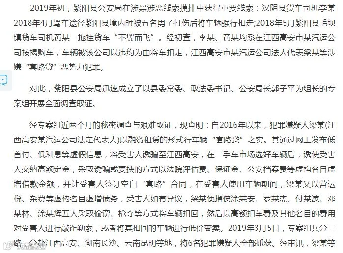 江西高安市某汽运公司按揭购车,通过网上发布低首付、低利息等虚假信息,购车后,公司以违约为由将车扣走,江西高安市某汽运公司法人代表梁某等涉嫌“套路贷”恶势力犯罪。