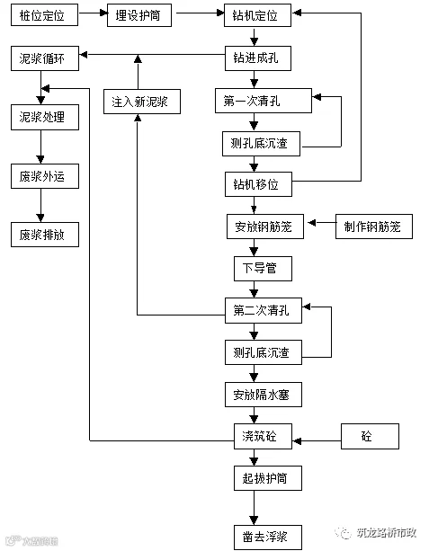 (1)、工艺流程:测量放线——埋设护筒——桩机就位(钢筋笼制作)——挖孔至终孔——钢筋笼按放——砼导管按放——浇筑砼