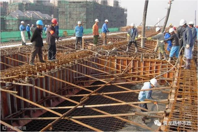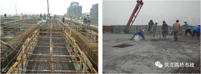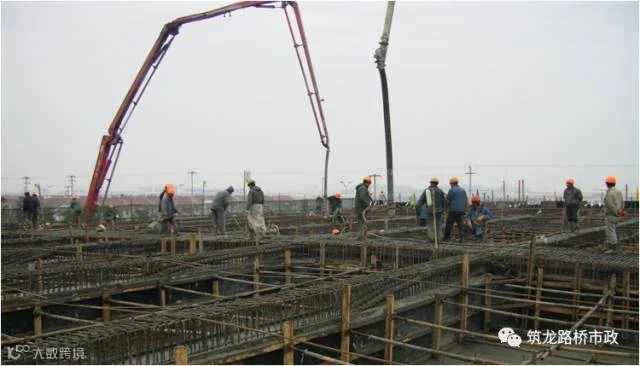 (2)、混凝土浇筑应对称纵向中心线,先中心,后两侧对称浇筑。混凝土分层厚度为30cm,浇注过程中,随时检查混凝土的坍落度。