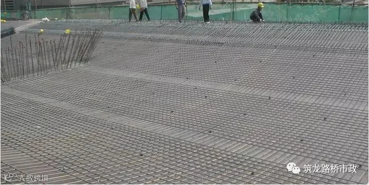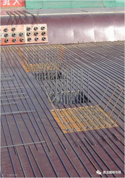 (6)待混凝土强度满足设计要求以后,安装和绑扎顶板上下层钢筋网、侧角钢筋和护栏、伸缩缝等预埋件。