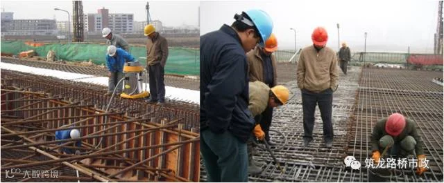 (4)、振动棒振捣时与侧模保持5~10cm的距离,避免振捣棒接触模板和预应力管道等。振捣上层混凝土时,振捣棒要插入下层混凝土10cm左右。对每一振动部位振捣至混凝土停止下沉,不再冒气泡,表面平坦、泛浆为止,避免漏振或过振,每一处振完后应徐徐提出振动棒。
