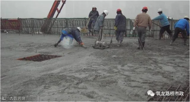 (7)第二次浇筑箱梁顶板混凝土浇筑完毕后,混凝土收浆抹面后进行横桥向人工拉毛,深度控制在1~2mm。抹面分两次,第一次抹面对混凝土进行找平,在混凝土接近终凝、表面无泌水时,进行二次抹面收光。拉毛要掌握好时间,早了带浆严重,影响平整度,晚了则深度不够,一般凭经验,在砼表面用手指压时有轻微硬感时拉毛为宜。