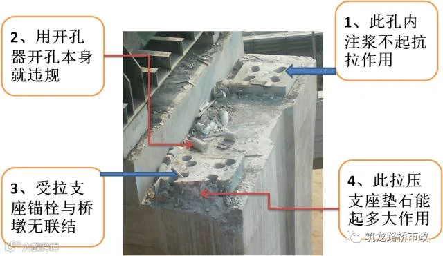 拉压支座的施工方法是本次事故的关键所在,如何使支座通过锚栓与桥墩和钢箱梁有可靠的联接,钢箱梁的偏心荷载通过拉压锚栓有效传递给桥墩,就不会有这样的事故。