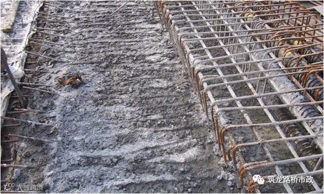 (6)、第一次浇筑混凝土后,浇注至腹板顶部时,做好施工缝。混凝土高度略高出设计腹板顶部1cm左右,将顶面的水泥浆和松散砼凿除掉,露出坚硬的混凝土粗糙面,用水冲洗干净。