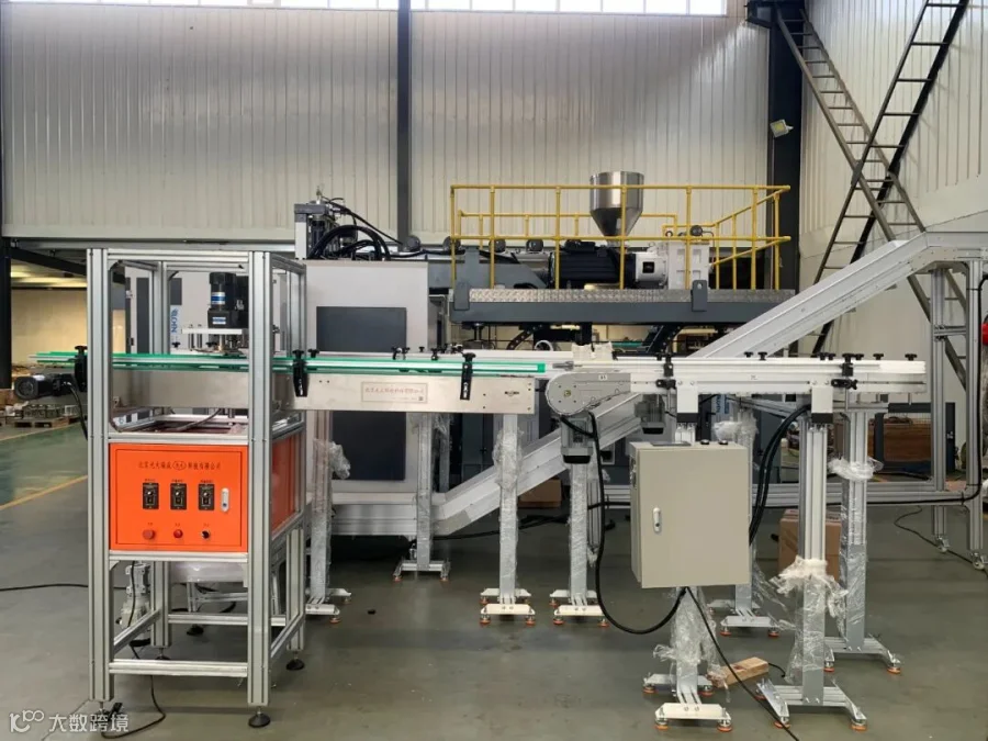 该设备内置飞边收集系统,底部配置链片式传送带,可将水口料传送至一侧,进行集中粉碎。