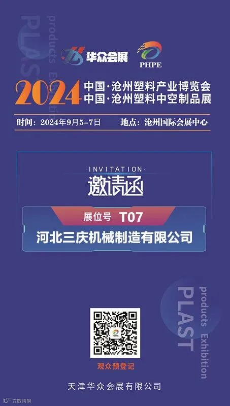 三庆公司 将参加本次2024年9月5~7日于沧州国际会展中心举办的2024 沧州塑料产业博览会,在此诚邀您莅临T07展位,观展客户可通过留言或联系本司电话,进行展会登记,获得展会入场码。