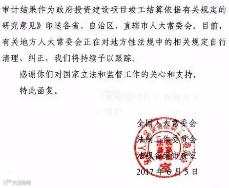 6月5日,法工委复函《关于对地方性法规中以审计结果作为政府投资建设项目竣工结算依据有关规定提出的审查建议的复函》。该复函提出,经过充分调研和征求意见,认为地方性法规中直接以审计结果作为竣工结算依据和应当在招标文件中载明或者在合同中约定以审计结果作为竣工结算依据的规定,限制了民事权利,超越了地方立法权限,应当予以纠正。