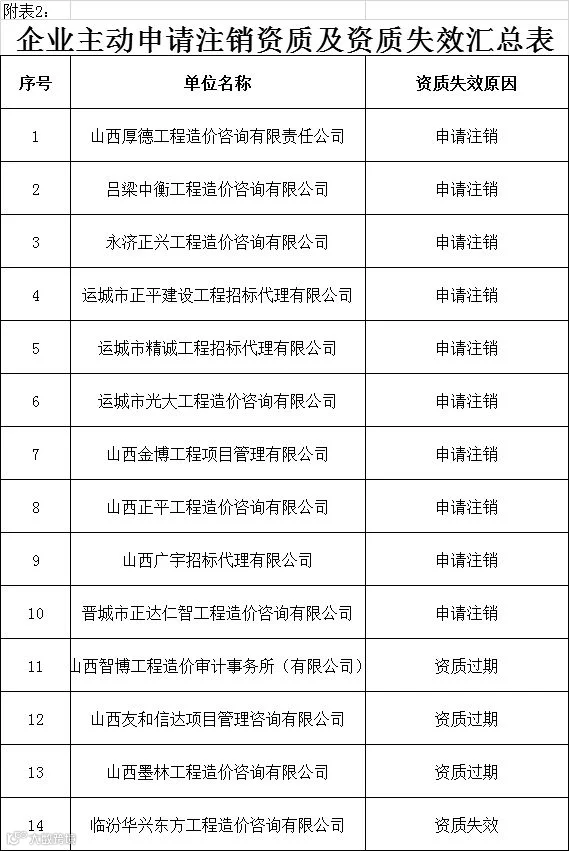 一、本次专项治理因注册造价师人数不足,拟撤回山西中和坤源工程项目管理有限公司等12家工程造价咨询企业乙级资质(附表1);山西厚德工程造价咨询有限责任公司等10家企业主动申请注销资质,山西智博工程造价审计事务所(有限公司)1家甲级资质、山西墨林工程造价咨询有限公司等3家乙级资质企业因资质过期自行失效(附表2)。