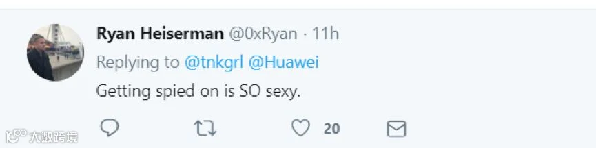 还有外国网友调侃其一些西方国家的政府不断炒作的“华为在监控你!”的论调,称“原来被监控是一件如此性感的事情啊~~”