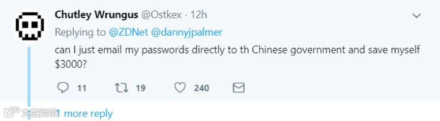 在美国科技网站Zdnet的账号下,有外国网友同样脑洞大开地用“华为是间谍”的段子调侃说:“我愿意把我的用户名和密码都交给中国政府,只求你们给我打个3000美元的折扣….”。这个留言也获得了最多的240个点赞。