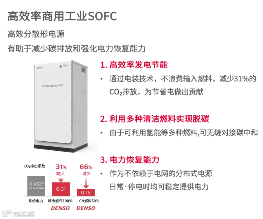 利用SOEC生产的氢气,也可以通过氢气燃料电池的反应产生电能,电装正致力于开发的SOFC,是通过氢气与其他燃料和氧气之间的化学反应产生电力和热量的燃料电池。同时为了更好的普及从而促进实现碳中和,电装在兼顾环境友好和经济适用的前提下进行该产品的开发。