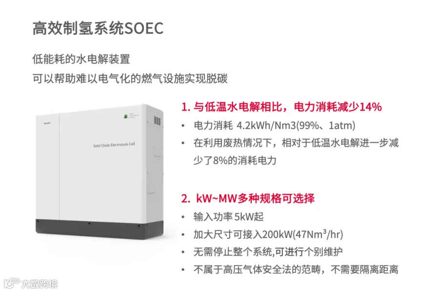 电装开发的SOEC是以高效率为优势的水电解装置,可助力促进削减能耗,提高氢气制造效率。因其使用的陶瓷材料可在约700℃高温下反应,制氢所需的能耗也会对应削减。作为备受期待的新一代水电解装置,其可有效利用余热,避免造成热能浪费,并稳定提供低碳电力,从理论上,效率是高于低温制氢模式的。