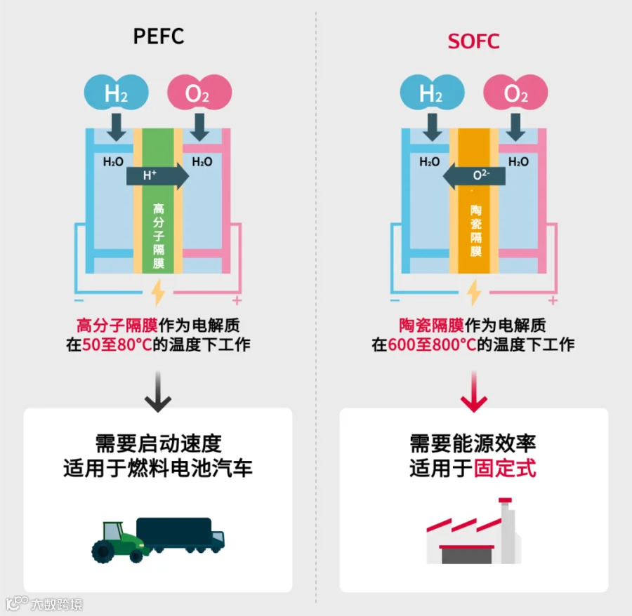 根据使用的电解质和工作温度进行燃料电池的类型划分。FCEV(燃料电池汽车)中所使用的燃料电池称为PEFC,PEFC使用高分子隔膜作为电解质膜。高分子隔膜在约100°C下反应,其特点是启动时间短。SOFC使用的是陶瓷隔膜,其反应温度可高达700℃。由于温度高,启动时间比PEFC长,但同时也具备能源效率高的特点, 因此更适用于固定装载模式。