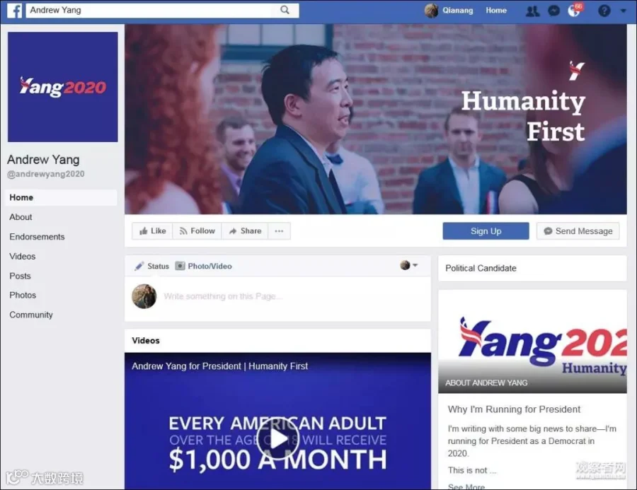 在他的facebook竞选页的右上角,赫然写着“Humanity First(人性之上)”。