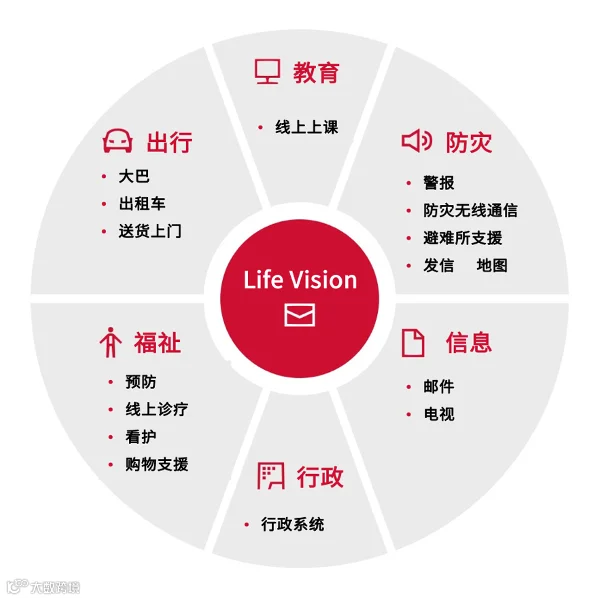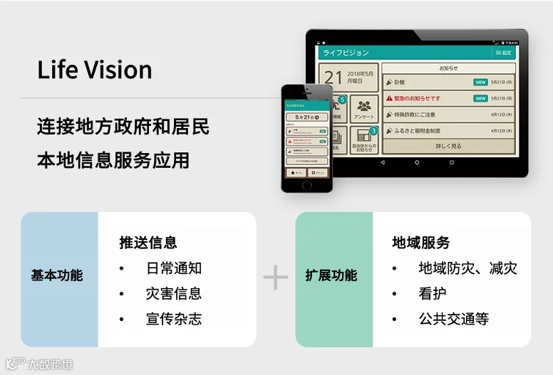 Life Vision的基本功能是连接地方政府和居民的信息服务应用。当地居民可通过应用轻松获取政府发送的信息。在基本功能之外,还可以灵活添加当地需求的功能如响应式交通的合作等。