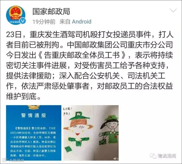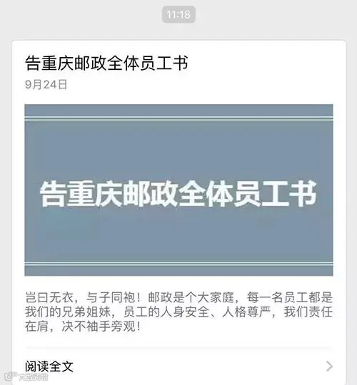 9月24日11时,重庆邮政官方微信发布《告重庆邮政全体员工书》,表明坚决态度:“邮政是个大家庭,每一名员工都是我们的兄弟姐妹,员工的人身安全、人格尊严,我们责任在肩,决不袖手旁观!”