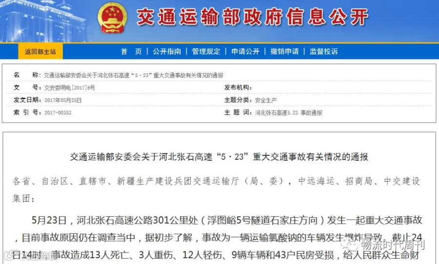 交通运输部安委会关于河北张石高速“5·23”重大交通事故有关情况的通报