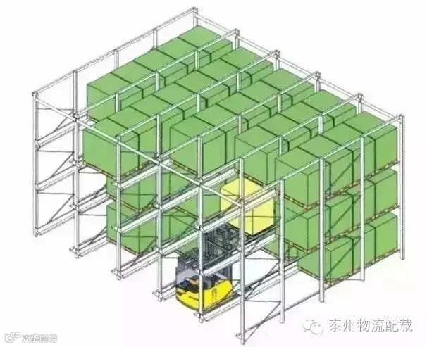 这样的仓库,在排与排之间没有作业通道,大大提高了仓库面积利用率。但使用时,最好同一排、同一层上的货物,应为相同的货物或一次同时入库和出库的货物。层高可调,配以各种型号叉车或堆垛机,能实现各种托盘的快捷存取,单元货格最大承载可达5000kg,是各行各业最常用的存储方式。