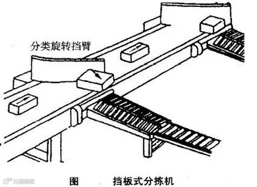 挡板式分拣机是利用一个挡板(挡杆)挡住在输送机上向前移动的商品,将商品引导到一侧的滑道排出。挡板的另一种形式是挡板一端作为支点,可作旋转。挡板动作时,像一堵墙似地挡住商品向前移动,利用输送机对商品的摩擦力推动,使商品沿着挡板表面移动,从主输送机上排出至滑道。平时挡板处于主输送机一侧,可让商品继续前移;如挡板作横向移动或旋转,则商品就排向滑道。