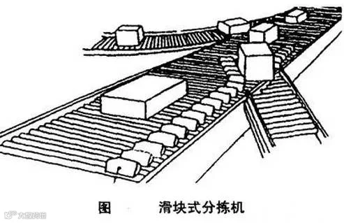 滑块式分拣机如图所示,它也是一种特殊形式的条板输送机。输送机的表面用金属条板或管子构成,如竹席状,而在每个条板或管子上有一枚用硬质材料制成的导向滑块,能沿条板作横向滑动。