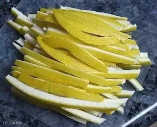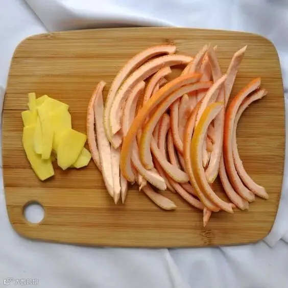 再把柚子皮切成细条,放入热水中,加上两勺盐,搅拌。然后换一次热水,浸泡2个小时左右。