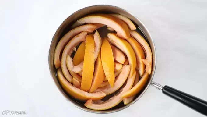 把柚子皮切成小片,放置在水中加热。