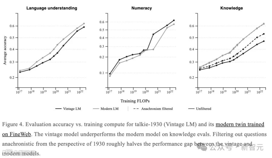 但在通用知识评测上,即使剔除了对1930年视角来说「穿越」的题目,talkie仍然落后。