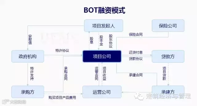 BOT(Bulid-Operate-Transfer)即建造-运营-移交方式,实质上是基础设施投资、建设和经营的一种方式,以ZF和私人机构之间达成协议为前提,由ZF向私人机构颁布特许,允许其在一定时期内筹集资金建设某一基础设施并管理和经营该设施及其相应的产品与服务。ZF对该机构提供的公共产品或服务的数量和价格可以有所限制,但保证私人资本具有获取利润的机会。整个过程中的风险由ZF和私人机构分担。当特许期限结束时,私人机构按约定将该设施移交给ZF部门,转由ZF指定部门经营和管理。