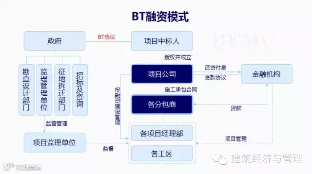 在市场经济条件下,BT模式是从BOT模式转化发展起来的新型投资模式。采用“BT”模式建设的项目,所有权是ZF或ZF下属的公司;ZF将项目的融资和建设特许权转让投资方;投资方是依法注册的国有建筑企业或私人企业;银行或其他金融机构根据项目的未来收益情况为项目提供融资贷款。