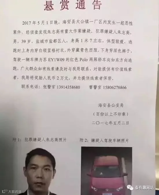5月1日晚间,江苏省南通市海安县大公镇一厂区内发生一起恶性案件,造成一死一伤。经海安警方连夜侦查发现盐城籍男子朱某有重大作案嫌疑,悬赏2万元征集破案线索。终于,嫌疑人现出了踪迹…